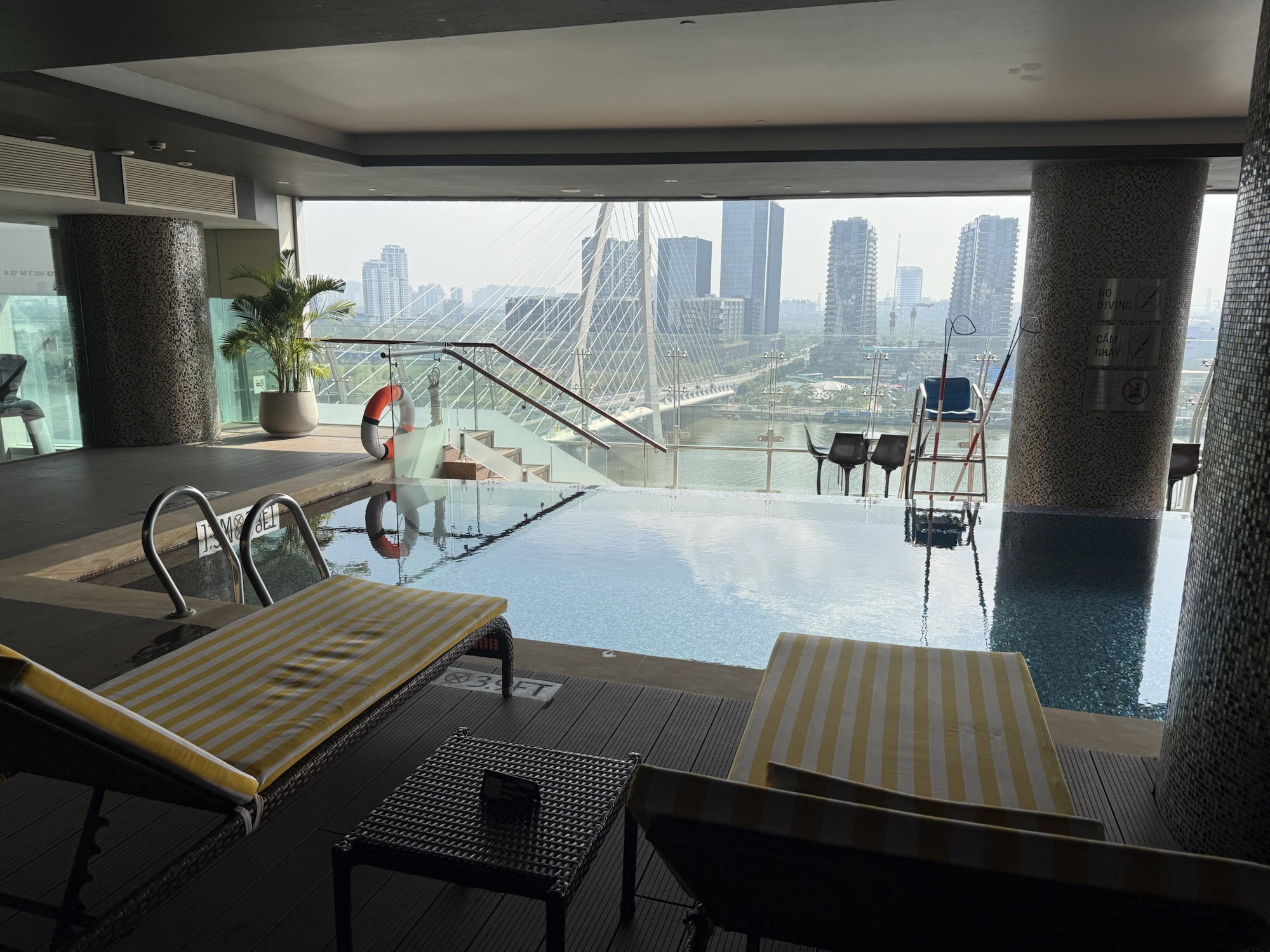 プールサイドからはサイゴン川と橋を一望。泳ぎ疲れたらデッキチェアで一休み。